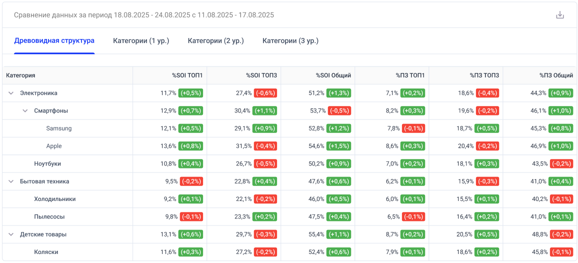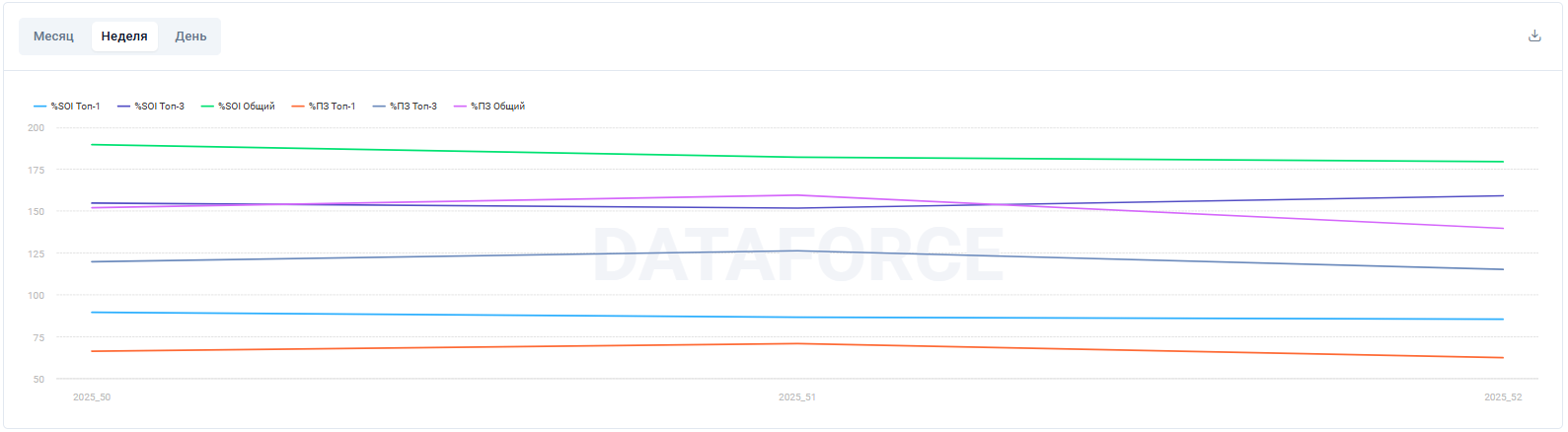 Все метрики, используемые в разделе «SOI Динамика» усредняются при отображении за период, а также при расчётах за один день, потому что в течение дня сборы происходят несколько раз в пиковые часы. Метрики %SOI относятся к доле спроса, а %ПЗ - к доле запросов.