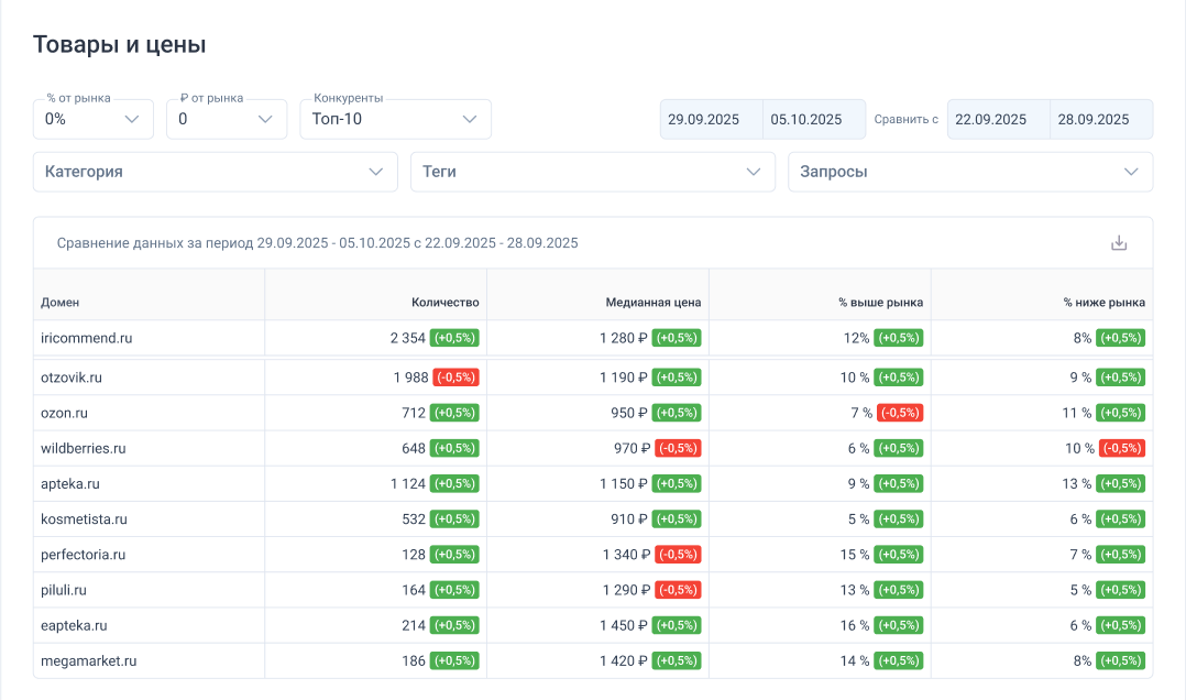 Назначение раздела Товар и Цены - мониторинг количества товаров, представленных вендором проекта и конкурентами, а также отслеживание доли товаров, цена которых выше или ниже уровня медианы среди всех товаров, представленных в Товарной галерее.