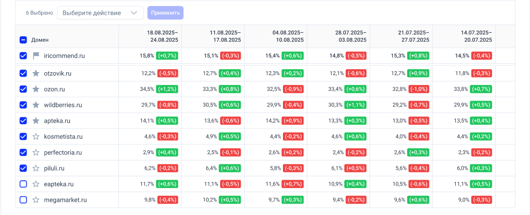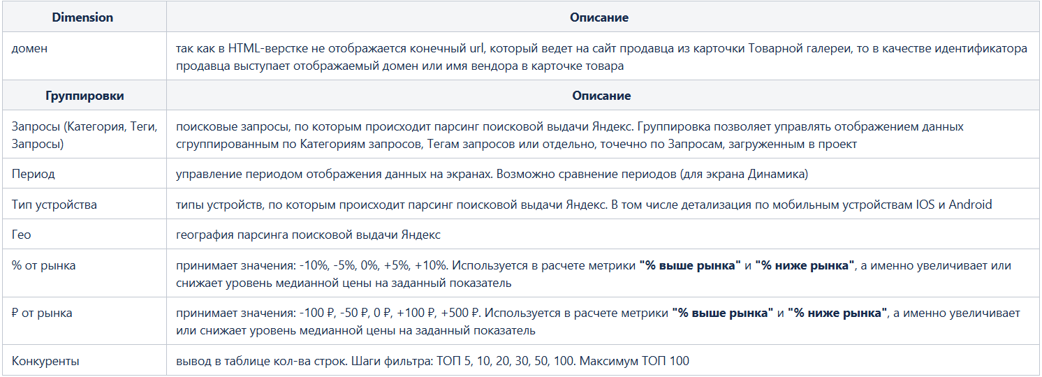 Процентная метрика. Показывает долю товаров домена, медианная цена которых выше медианной цены всех товаров по запросу. Рассчитывается с учетом фильтров % от рынка | ₽ от рынка