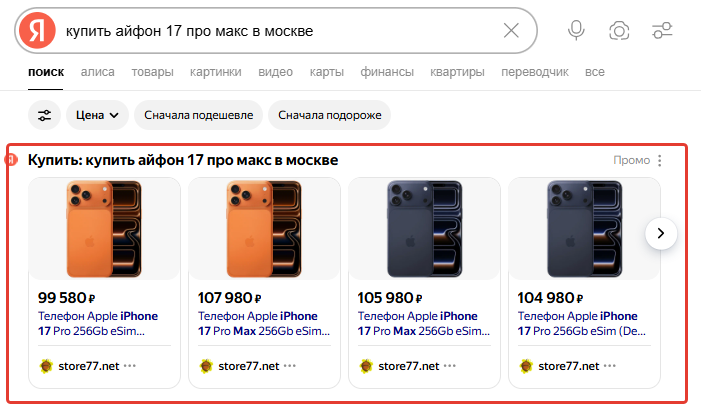 Как выглядит блок Товарная галерея Яндекс.Директ