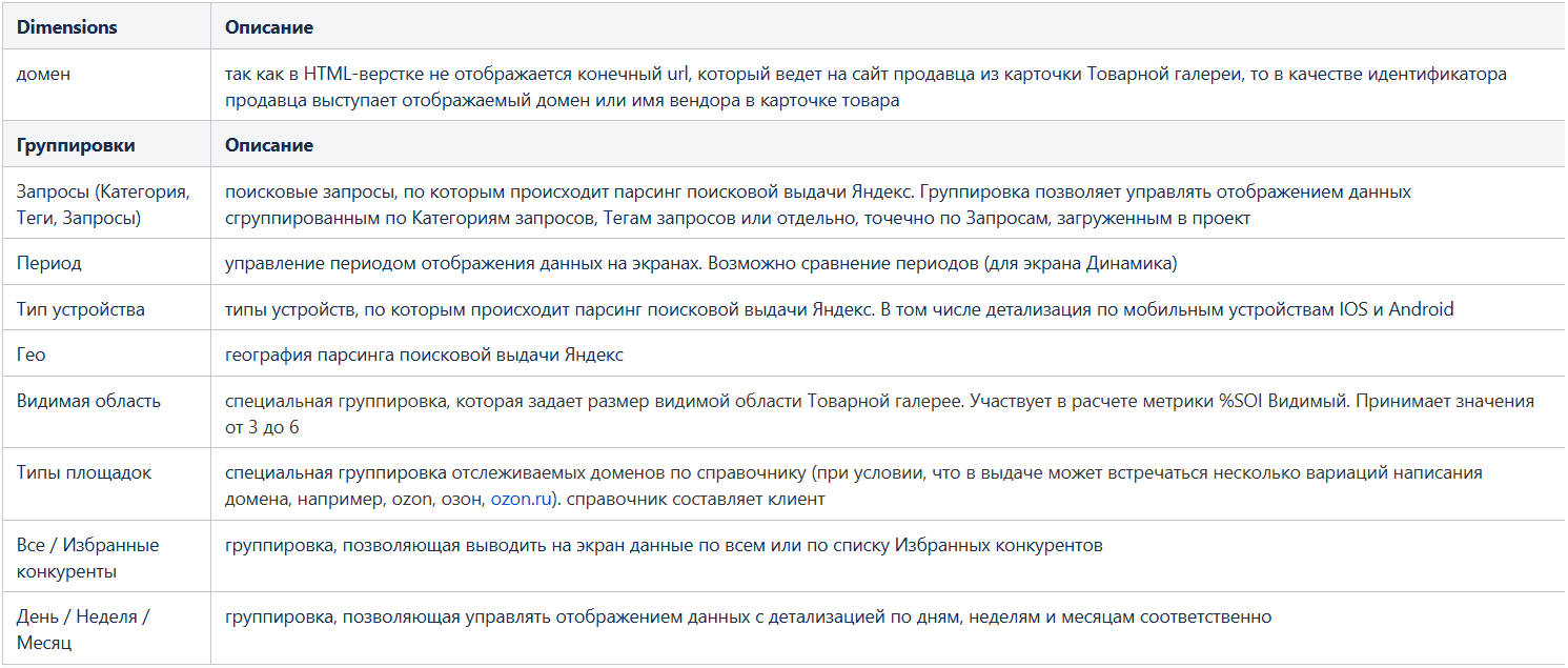 Основной метрикой экрана является метрика %SOI (Share of Impressions) - доля показов (упоминаний) проекта в результатах поисковой выдачи в блоке Товарная галерея Яндекс.Директ. Оценивая метрику %SOI по различным семантическим срезам, вхождениям в ТОП мест показов, и сравнивая свои показатели с показателями конкурентов можно сформировать детальное представление о присутствии проекта в результатах поисковой выдачи.
